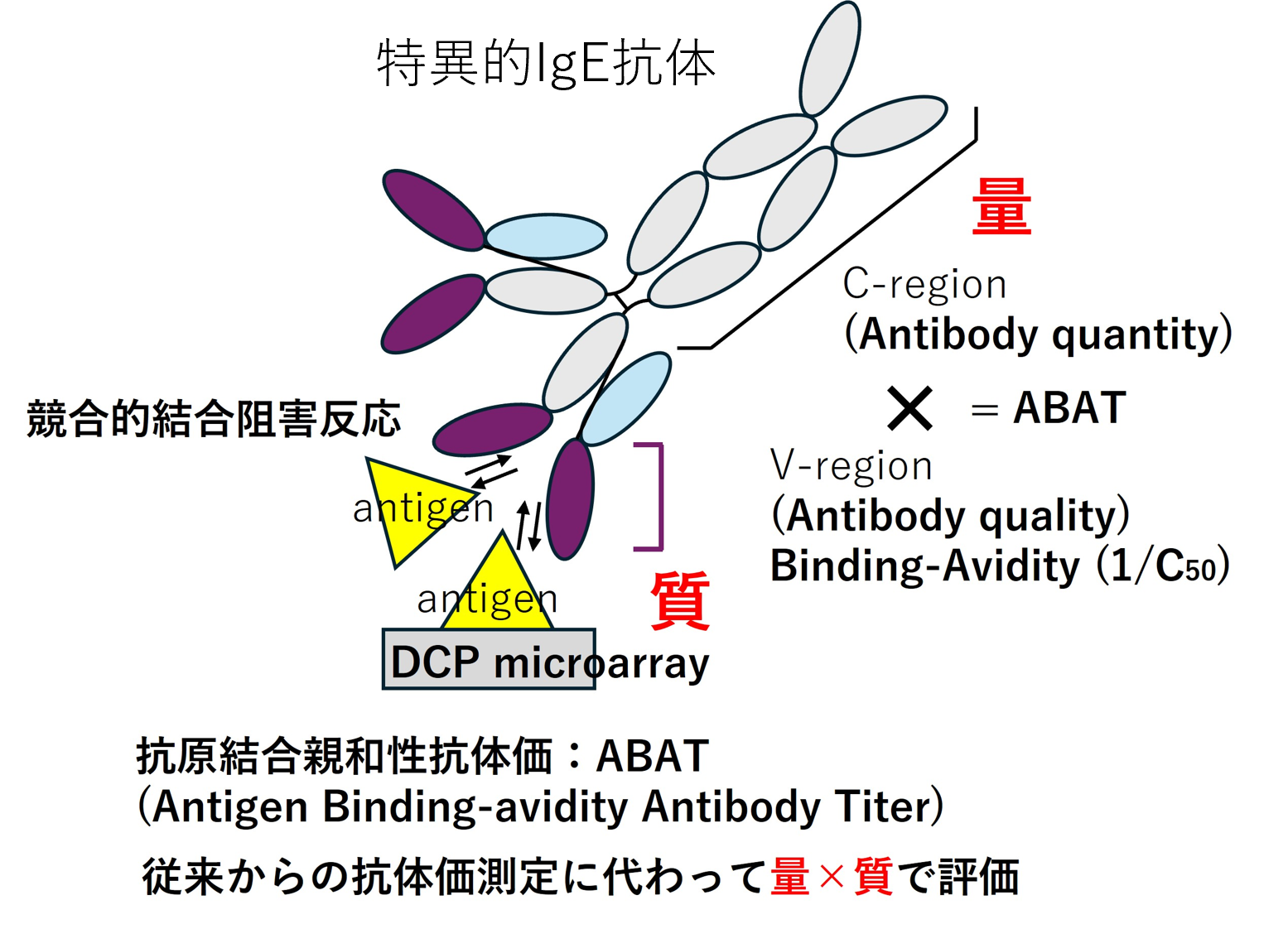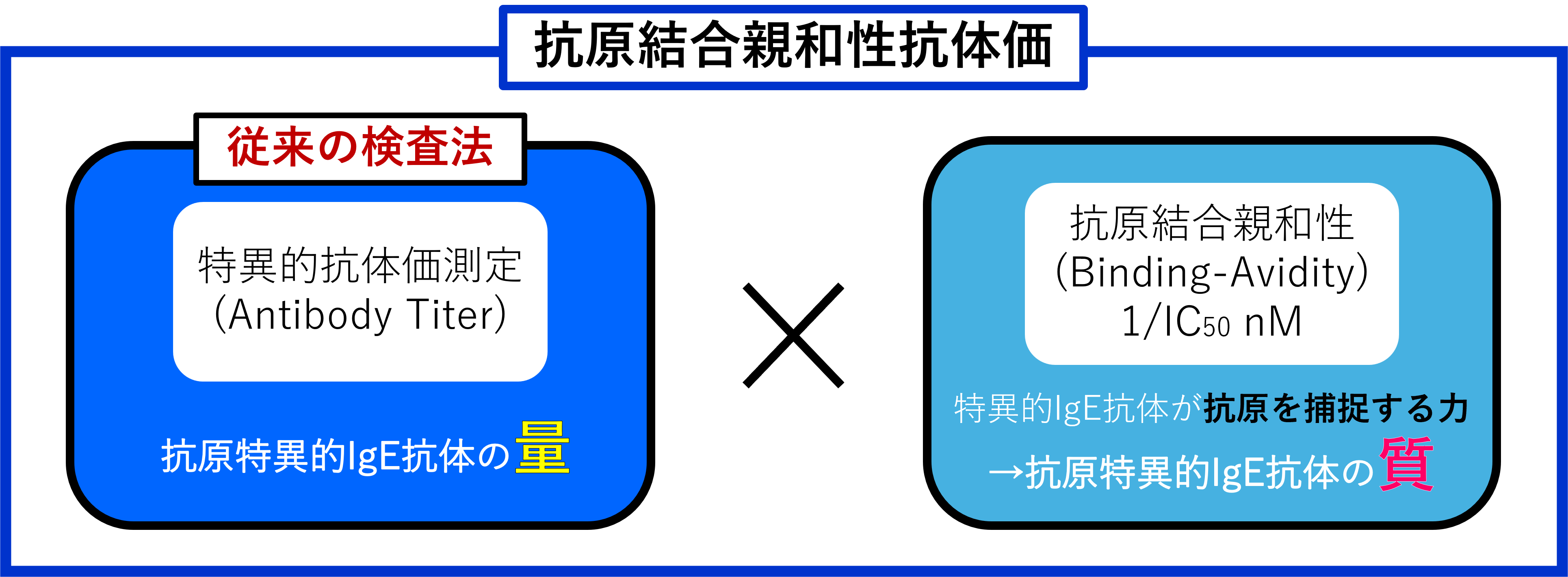 従来の検査法で用いられる特異的IgE抗体量を示す抗体価(Antibody Titer)に特異的IgE抗体が抗原を捕捉する力を表す抗原結合親和性(Binding-Avidity)を特異的IgE抗体の質として掛け合わせた新しい検査法