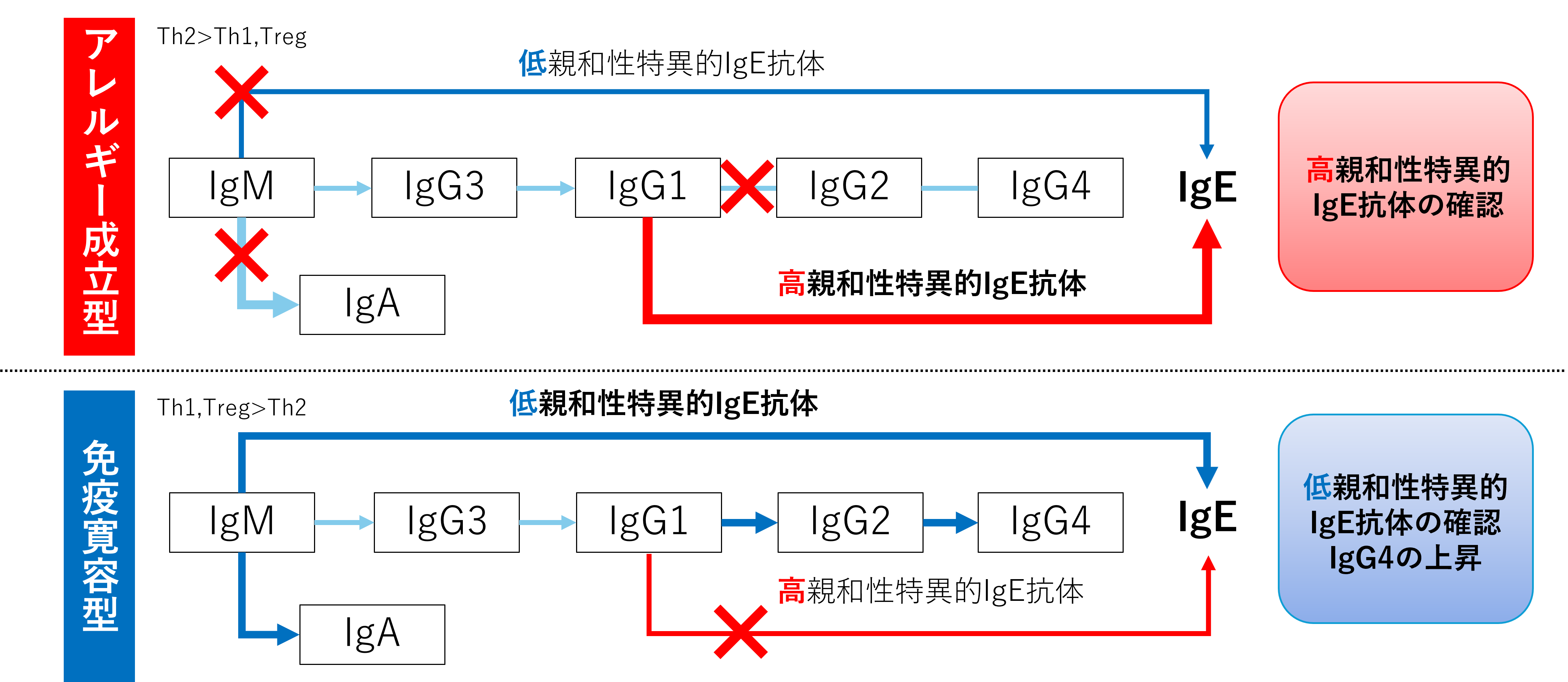 特異的IgG1やIgG4抗体はアレルギーの発症を抑制すると言われており、クラススイッチを追うことで今後アレルギーが増悪するか、脱感作に向かうかの予測や OIT後の脱感作状態についてモニタリングがしやすい