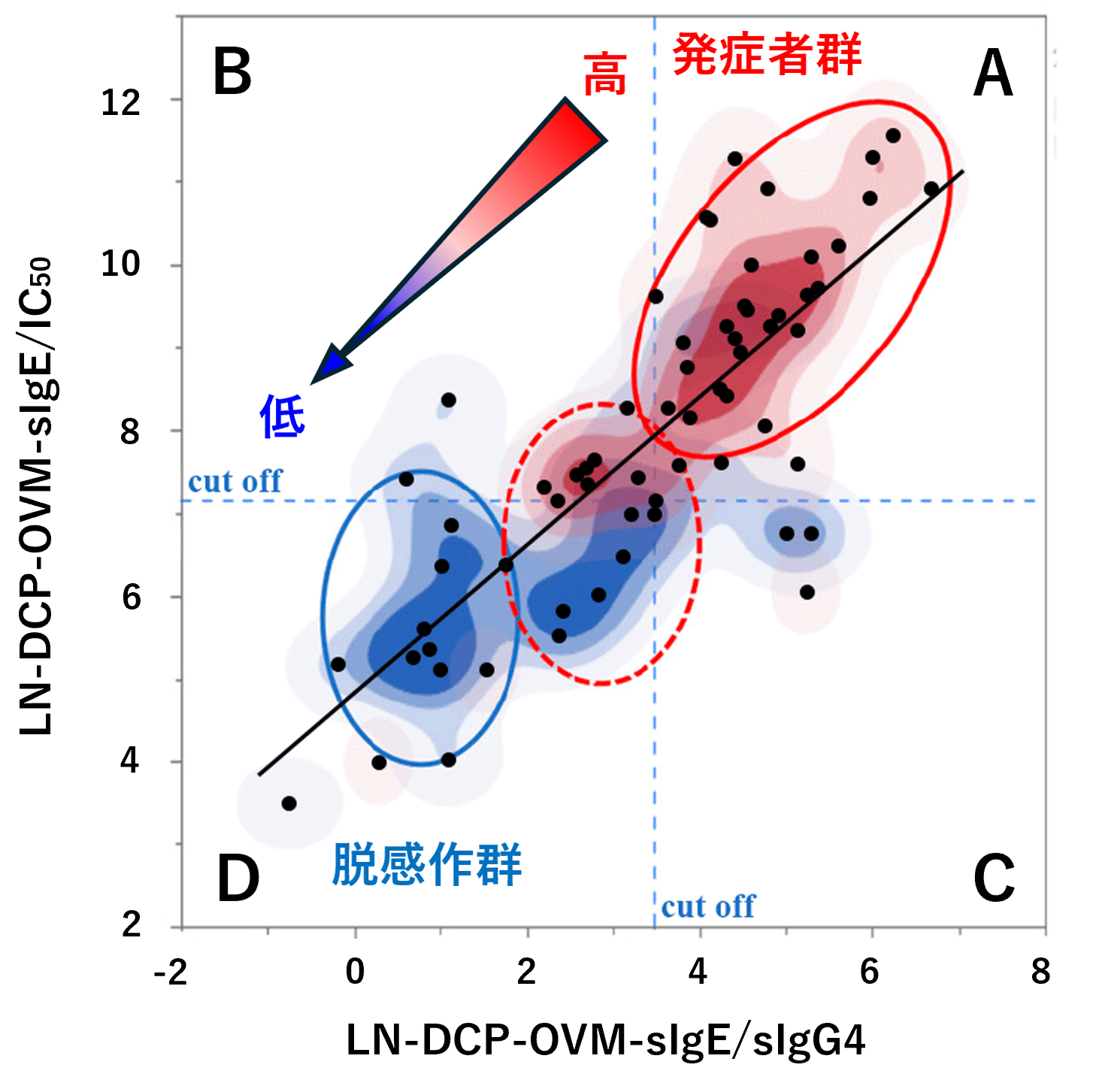 Binding-Avidity を用いたOVM-sIgE/IC50とLN-OVN-sIgE/OVM-sIgG4 をY軸、X軸に示し、ROC 解析から得られたカットオフ値で4分割に個々の患者データを配置