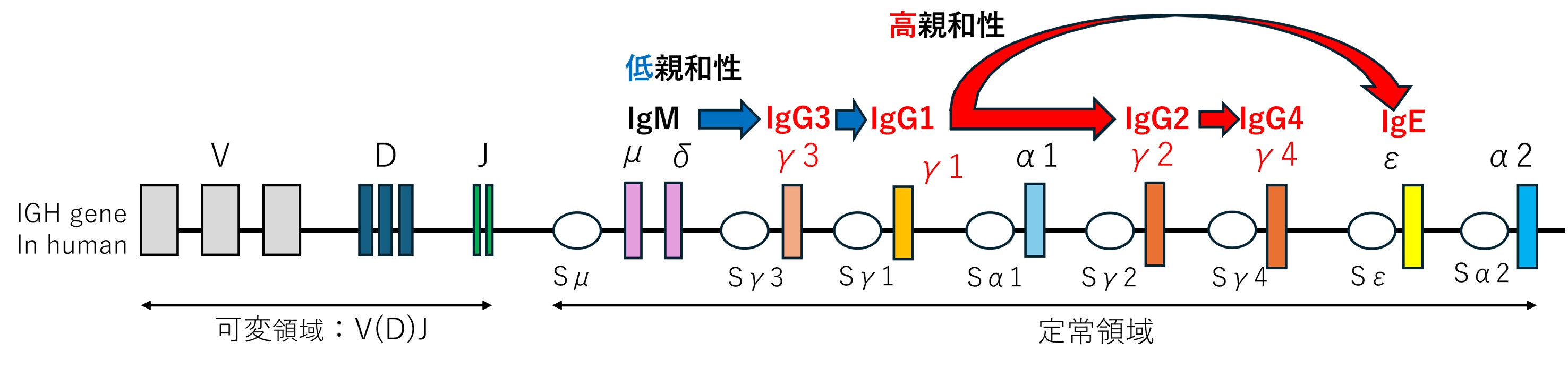 活性化B細胞における体細胞遺伝子組換えの過程で、可変部を変えずに一つの重鎖定常部(Fc領域)異なるアイソタイプの定常部に置換すること。IgMからIgGやIgA、IgEが産生される。これにより同一の抗原特異性を持ちながら異なった機能を持つ抗体が産生され、抗体の機能的多様性を増大させている。 |