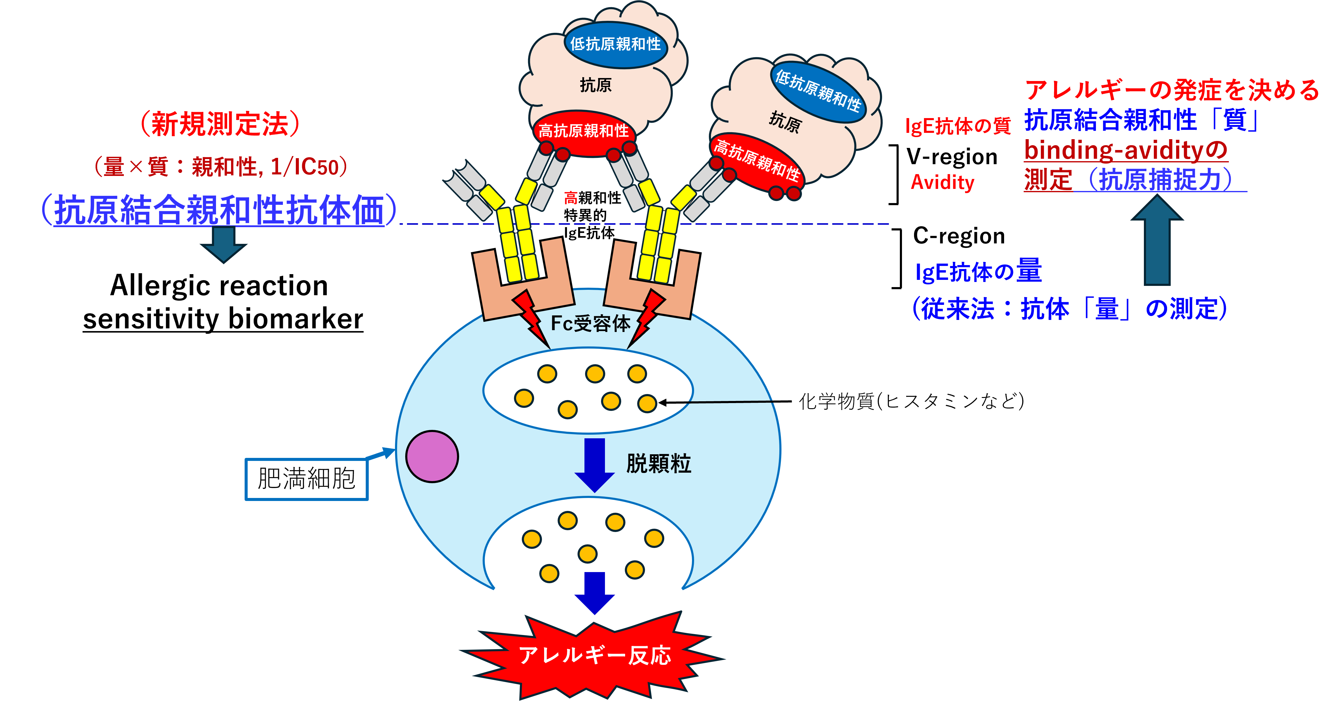 血清中の特異的IgE抗体を標的にして固相化した抗原と血清に様々な濃度の非固相化抗原を添加して平衡条件下で反応、洗浄後固相化した抗原に結合する抗体(抗原結合抗体)のみを測定し、抗原結合抗体が最大値の半分となる抗原の濃度(IC50)を算出し、その逆数を抗体の質を表す単位として抗原結合親和性(Binding-Avidity:1/IC50 nM)と定義する。