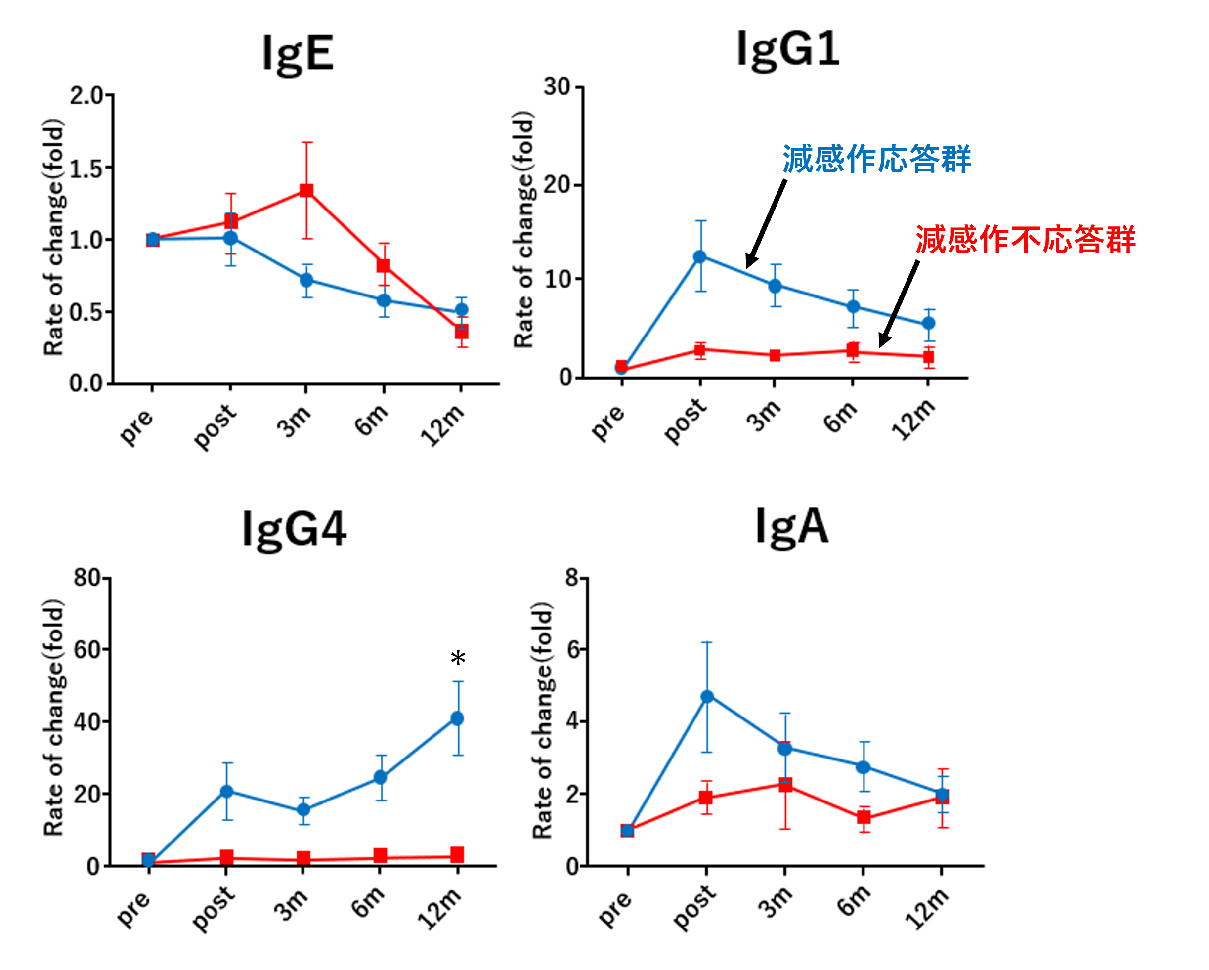 発症者群で脱感作に移行しない患者は、sIgG4の増加が低いことが原因と考えられる。